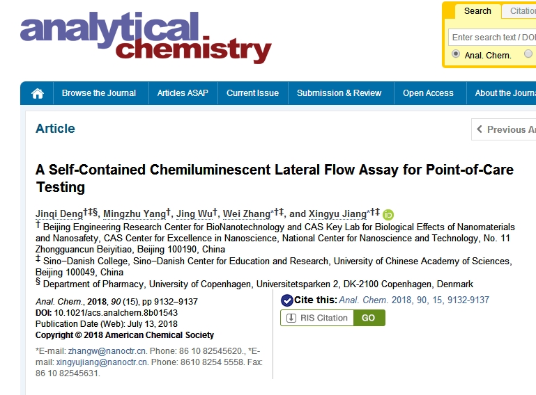 近日,国家纳米科学中心的蒋兴宇研究员及其研究团队设计了一种即时检测装置,将化学发光与胶体金免疫层析试纸完美的结合起来。该研究以题为“A self-contained chemiluminescent lateral flow assay for point-of-care testing”的文章发表在期刊Analytical Chemistry 上。