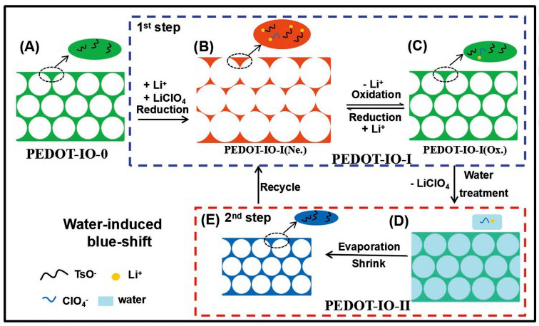 They prepared poly(3,4-ethylenedioxythiophene (PEDOT) photonic crystals (PEDOT-IO-0) by electropolymerization and found that the prepared PEDOT-IO has four states and three different switch forms. The first switch is The irreversible reduction process from PEDOT-IO-0 to PEDOT-IO-I (neutral state). The second switch is a reversible electrochemical process between PEDOT-IO-I (neutral state) and PEDOT-IO-I (oxidized state), accompanied by reversible bandgap due to ion doping/dedoping (structure Color changes. The third switch is water treatment PEDOT-IO-I (oxidation state) to form PEDOT-IO-II, due to water-induced LiClO4 molecules (Li+ and ClO4- ions) removal and periodic structural shrinkage, causing blue shift of photonic band gap .