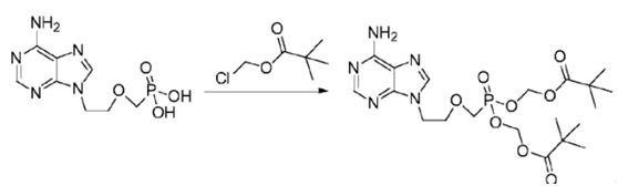 阿德福韦酯|142340-99-6的合成方法主要是以阿德福韦|106941-25-7为原料,与特戊酸氯甲酯进行缩合反应得到,反应方程式如下: