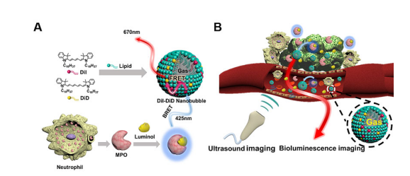 后来,北京大学戴志飞团队构建了一种新型的掺杂荧光染料的纳米泡,不仅能够用于超声造影成像,还能够有效地整合生物发光能量共振转移(BRET)及荧光能量共振转移(FRET),将鲁米诺产生的蓝光转换为 λmax为670 nm的近红外红光,实现了对深部炎症组织的高灵敏的生物发光成像。