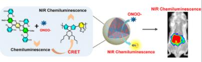 然而,目前用于过氧亚硝酸盐传感的成像方法,通常受荧光探针的背景/自发荧光高和化学发光探针的选择性、发射波长短的困扰。于是,此研究首次提出一种对过氧亚硝酸盐响应的新型化学发光分子(嵌入氧的醌型并五苯),在其基础上合理构建了一种通过化学发光共振能量转移(CRET)机制检测过氧亚硝酸盐的近红外纳米探针。
