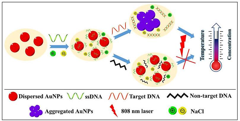这是一种基于光热效应的核酸检测方法,其原理是单链DNA(ssDNA)的引入(≥ 160 nM)可使未修饰的金纳米粒子(AuNP)在较高的盐浓度下(40 mM)仍保持单分散的状态,随着目标核酸的加入,单链DNA与目标物杂交,形成的双链DNA(dsDNA)失去对金纳米粒子的保护作用,从而导致金纳米粒子逐渐聚集。而金纳米粒子的聚集体具有较强的光热效应,在近红外激光(808 nm)的照射下,该反应体系的温度将迅速升高(≥ 10 °C)。