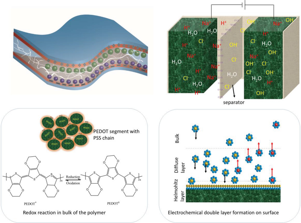研究人员开发的柔性超级电容器使用聚酯纤维素布作为基材和隔离膜,并使用聚(3,4-乙撑二氧噻吩):聚(苯乙烯磺酸盐)(PEDOT:PSS)作为汗液电解液的活性电极和集电器。使用汗液作为电解质主要是因为其相比当今广泛使用的有机电解质,具有无毒,安全且环境友好的优点。而PEDOT:PSS作为高活性材料,能够提供混合的离子导电性和电子导电性,与纺织品的更好粘合,低温加工以及良好的生物相容性。