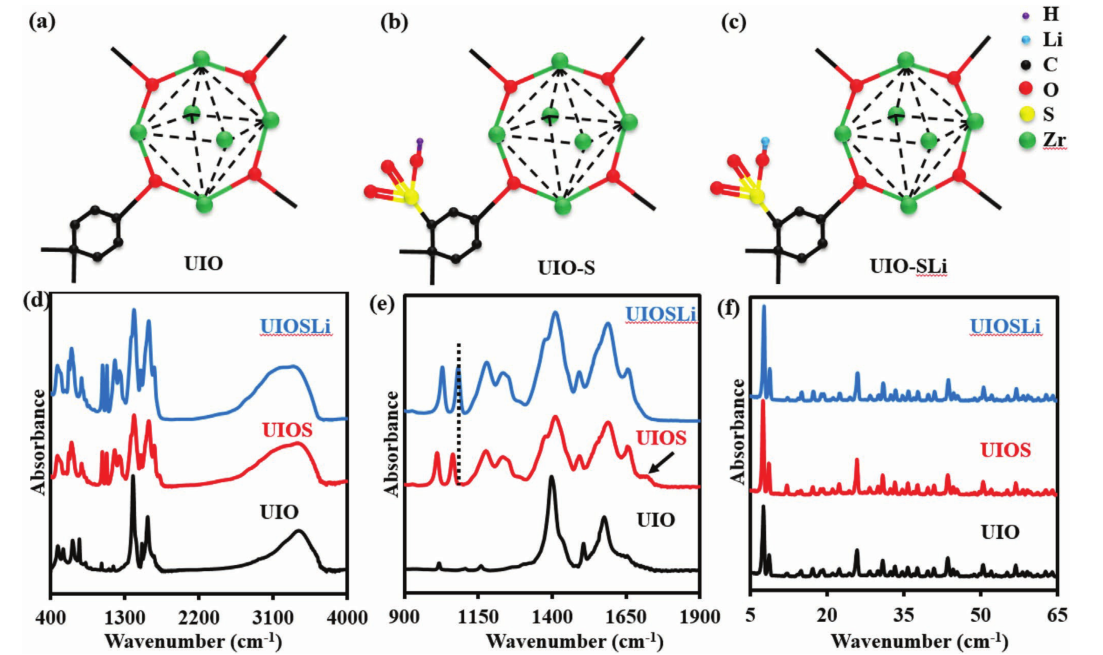 此项研究中,研究人员基于UIO结构同时接枝了硫酸锂(-SO3Li)基团(UIOSLi)以构建MOF固态电解质,将基于锂的离子液体(Li-IL)双(三氟甲磺酰基)酰亚胺锂整合到1-乙基-3-甲基咪唑鎓双(三氟甲基磺酰基)酰亚胺中后,得到的Li-IL/ UIOSLi固体电解质,其室温下的离子电导率为3.3×10−4 Scm-1。