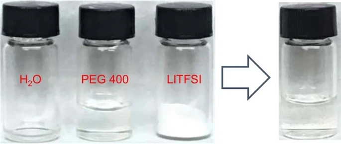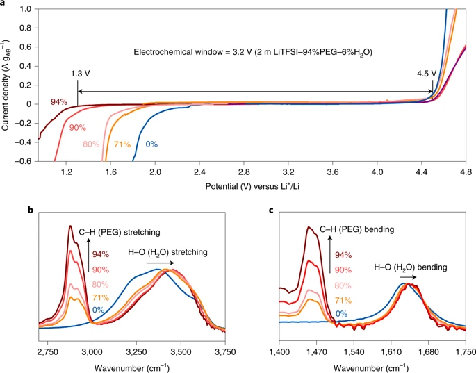 “分子拥挤”普遍存在于各种类型的细胞中,在活细胞中,分子拥挤现象可改变氢键结构,改变细胞中溶质分子的活性系数,也基本上抑制了水的活性。利用这一原理,研究人员使用与水混溶的聚合物聚乙二醇作为拥挤剂来降低水分子活性,当溶剂中含有低含量(2 mol kg-1)的双(三氟甲烷)磺酰亚胺锂盐(LiTFSi),就能够彻底的抑制水分解,从而实现了较宽的电解质工作范围(3.2 V)。