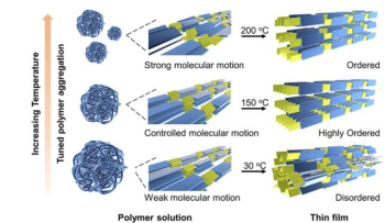 研究人员通过多重表征和理论模拟来揭示聚合物的溶液状态聚集。研究发现,高温会使溶液中的共轭主链发生显着的构象波动,从而促进聚合物从溶剂化聚集体到有序堆积结构的结晶。在较高温度下沉积的聚合物薄膜比在室温下沉积的薄膜具有更多的有序堆积和更少的结构无序。与无序样品相比,有序堆积的聚合物薄膜在场效应晶体管显示出更高的载流子迁移率(高达两个数量级)。