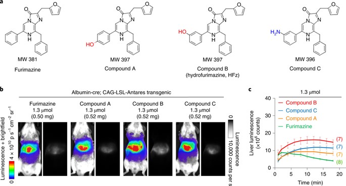 这两种新型NanoLuc荧光素酶底物分别是hydrofurimazin和fluorofurimazine。研究人员先是开发出了hydrofurimazin,其结合Antares荧光素酶,在肝脏中表现出和使用AkaLuc荧光素酶及其底物AkaLuc相似的亮度,而且其提高的水溶性有利于向小鼠递送更高的剂量。接着,研究人员经过进一步的化学探索开发了fluorofurimazine,fluorofurimazine相比hydrofurimazin在小鼠体内具有更高的亮度。