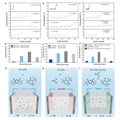 研究人员选择中盐浓度为3M作为模型体系,设计了三种电解质(1.5M LiNO3 1.5M LiTFSi,1M LiNO3 2M LiTFSi和0.5M LiNO3 2.5M LiTFSi),并以含3 M LiNO3或3 M LiTFSi的电解质为对照组。实验结果和AIMD模拟表明,在N,N二甲基乙酰胺中使用1 M LiNO3 、2 M LiTFSi的优化电解质可以促进LiF和富含LiNxOy的SEI膜的形成,从而保护锂负极避免枝晶生长和腐蚀,并实现更快的传质和电极传输动力学。并且,锂对称电池(1800 h)和锂氧电池(180次循环)在基于DMA的电解质中均具有最佳的循环性能。