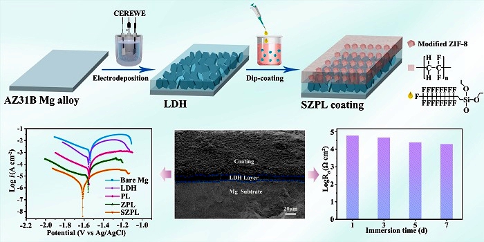 西北师范大学李健教授课题组通过电沉积和浸涂法在镁合金上制备了超疏水ZIF-8/ PVDF/LDH(SZPL)双层涂层,该涂层由下面的层状双氢氧化物(LDH)过渡结构和顶部超疏水ZIF-8层组成。SZPL涂层表现出优异的防腐蚀性能,其腐蚀保护效率高达99.9%,即使在浸泡七天后仍然具有较好的防腐蚀性能。而且表面在经过多次砂纸磨擦循环后仍呈现出色的耐磨性。同时,该双层涂层的超疏水、超低表面能特性赋予涂层优异的自清洁性能,能够有效的抗拒污染物。