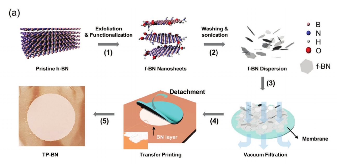 近日,韩国科学技术院(KAIST)开发了一种基于去溶剂化诱导的粘合转换(DIAS)机制转印由密集堆叠的氮化硼(BN)纳米片组成的高质量氮化硼(BN)膜的通用方法,突破了氮化硼薄膜材料合成难度大且质量难保证的局限性。