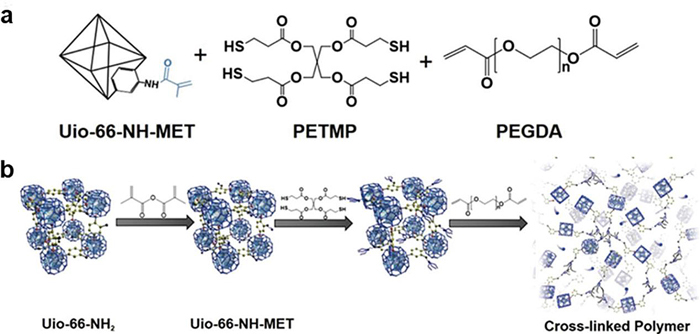 这是一种硫醇支化固体聚合物电解质(M-S-PEGDA),研究人员从分子设计的角度出发,以四(3-巯基丙酸)季戊四醇(PETMP)、表面功能化MOF(Uio-66-MET)和新型聚乙二醇二丙烯酸酯(PEGDA,10000 g/mol)为原料设计而成。