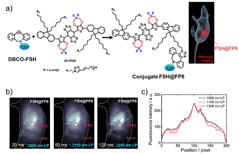 最后,通过点击化学反应,将荧光分子与卵泡刺激素(FSH)共轭连接,得到靶向荧光探针FSH@FP8,并成功实现对小鼠卵巢的靶向成像(图4)。
