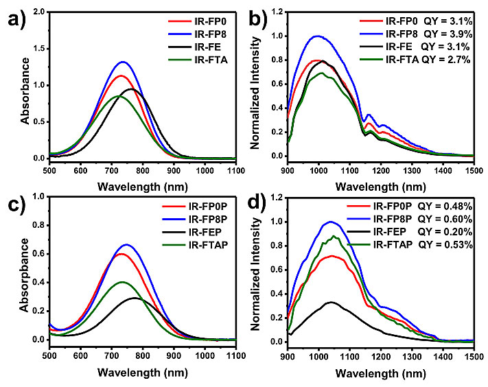 团队对所设计的荧光分子在甲苯及磷酸缓冲盐溶液(PBS)中的吸收和荧光光谱进行测试(图2),发现以PDOT作为给体单元的IR-FP8P在水溶液中具有显著提高的峰吸收系数和荧光量子产率。IR-FP8P的荧光量子产率为0.6%(以IR-26为0.05%作为参照),峰吸收系数为1.3×104 M-1•cm-1,在808 nm波长下的荧光亮度为60,是IR-FTAP的3.7倍,IR-FEP的5.7倍。
