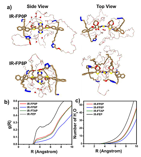 分子动态模拟计算发现,带有双辛基的PDOT给体单元对荧光分子骨架具有非常好的保护作用,有效防止分子与水的相互作用(图3)。以受体单元BBTD为中心,同一半径范围内,IR-FP8P分子周围具有最少的水分子分布。