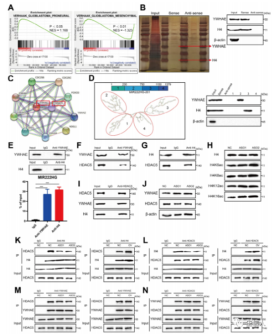 核定位MIR222HG特异性参与PMT已经明确,聚焦其中机制。作者对MIR222HG敲低的GSC267细胞进行了RNA测序,并通过RNA敲低分离出与MIR222HG结合的蛋白进行质谱分析。RNA-seq数据的GSEA (GEO: GSE213310)表明,MIR222HG在转录组水平上介导GSC中的PMT(图3A).核内LncRNA可通过组蛋白修饰参与调节转录水平,质谱分析结果证明,MIR222HG可以结合组蛋白H4(图3B)。鉴于RNA-seq数据中没有发现与组蛋白相对应的组蛋白修饰酶,作者推测在质谱数据中可能存在参与组蛋白修饰的中间蛋白。通过STRING数据库预测与所有剩余核内蛋白的相互作用,作者发现只有YWHAE可以与组蛋白修饰酶HDAC5结合(图3C)。因此,作者推测MIR222HG可能通过YWHAE与HDAC5的结合修饰H4参与PMT。组蛋白去乙酰化是促进肿瘤发展的重要因素已是不争的事实。先前研究已证实,组蛋白去乙酰化可促进GSC生长并增强MES亚型。HDAC5是一种负责组蛋白去乙酰化的酶,作者假定,MIR222HG可能通过YWHAE与HDAC5的结合修饰H4参与PMT,并进行下游机制验证,作者使用RNAfold WebServer对MIR222HG的二级结构进行预测表明,YWHAE与MIR222HG的二级结构2(核苷酸230-750)结合,H4与MIR222HG的二级结构3(核苷酸750-1150)结合(图3D)。并且再次使用RIP实验验证了MIR222HG与YWHAE和H4的结合。Co-IP证实了YWHAE与HDAC5的结合以及H4与HDAC5的结合(图3F,G,I)。Western blotting结果显示,敲低MIR222HG后,YWHAE和HDAC5的表达没有变化,RNA-seq结果也未观察到转录水平上YWHAE和HDAC5的表达变化,提示MIR222HG不影响细胞内YWHAE和HDAC5的含量(图J)。