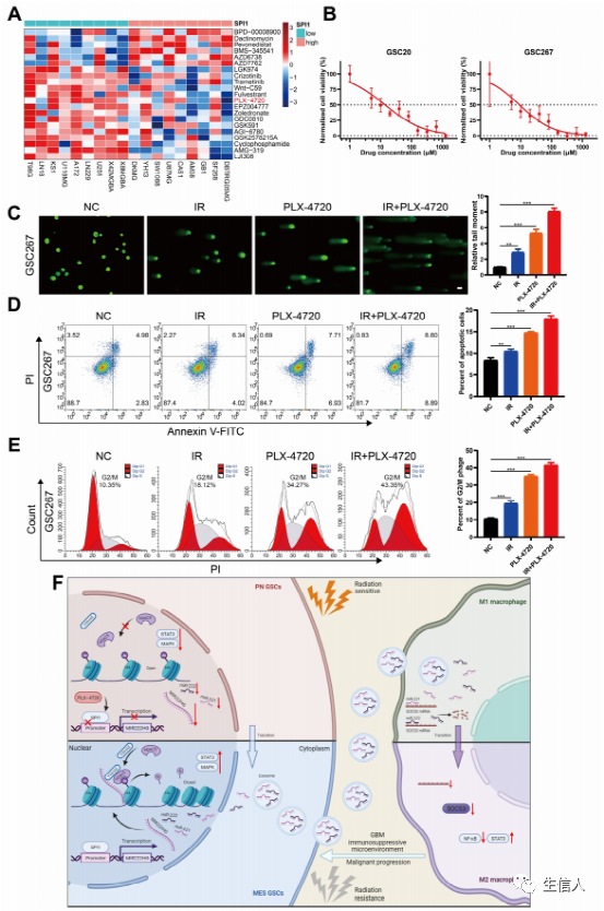最后,作者使用PLX-4720筛选与SPI1表达相关的GBM细胞敏感性。这些实验证实了mGSCs对PLX-4720敏感,与放疗联合使用可显著提高治疗效果。