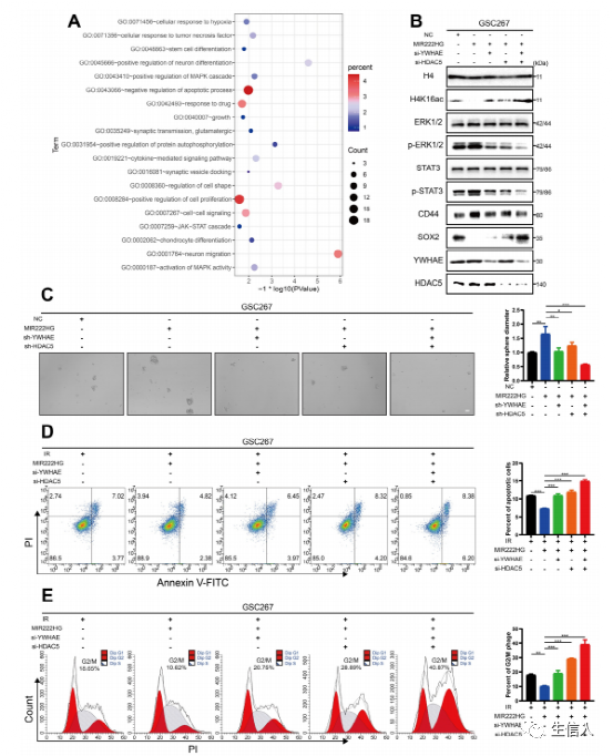 作者进一步探究mir222hg通过YWHAE/ HDAC5复合物介导的H4K16去乙酰化后下游通路的变化,基于先前测序结果的富集分析显示,MIR222HG的敲低导致MAPK和JAK-STAT通路的变化(图4A)。STAT3通路已被广泛记录为与MES亚型相关的经典通路,而ERK-MAPK通路先前已被证明是促成GSCs的MES样亚型状态的关键因素。作者通过干扰MIR222HG复合体中的两个关键蛋白YWHAE和HDAC5,验证下游通路的变化。Western blot分析证实,MIR222HG过表达后P-ERK1/2和P-STAT3水平显著升高,而敲低YWHAE或HDAC5可减弱P-ERK1/2和P-STAT3的升高,联合敲低YWHAE和HDAC5进一步降低P-ERK1/2和P-STAT3水平。MIR222HG过表达导致H4K16乙酰化增强,CD44表达升高,SOX2表达降低。敲低YWHAE或HDAC5部分逆转了这些变化,YWHAE和HDAC5联合敲低进一步逆转了H4K16ac、CD44和SOX2水平的变化(图4B)。MIR222HG的过表达增强了GSC的自我更新,YWHAE或HDAC5的敲低部分逆转了这种变化,联合敲低YWHAE和HDAC5的进一步逆转了这种变化(图4C)。细胞凋亡和细胞周期实验表明,过表达MIR222HG后GSCs对放疗的抗性增加被YWHAE或HDAC5的敲低部分逆转,YWHAE和HDAC5的联合敲低进一步逆转(图4D)。