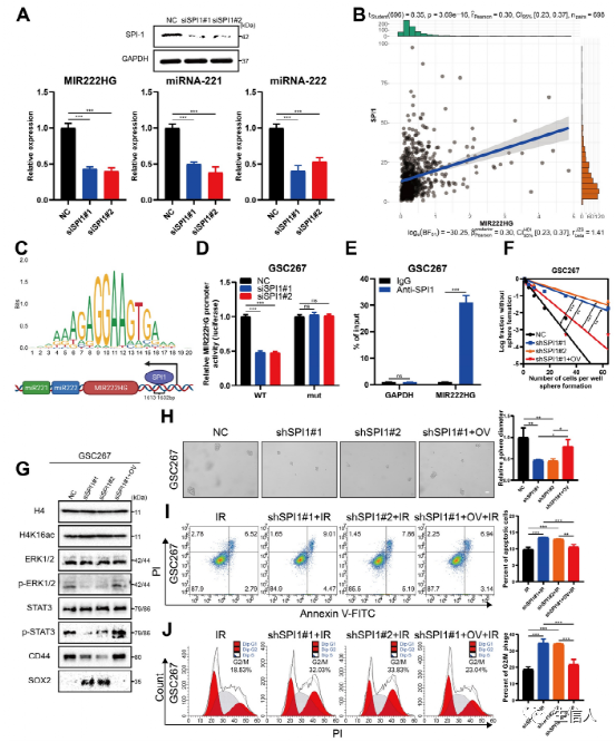 接下来,作者聚焦调节MIR222HG、miR221和miR222表达的常见上游靶点。使用JASPAR,预测了MIR222HG基因的转录因子,并初步确定了11个潜在的转录因子。通过生信分析这些转录因子与预后、亚型和免疫特性的关系,我们最终将转录因子SPI1作为目标。基于Verhaak和Phillips基因集的GSEA显示,SPI1的高表达在MES亚型中更为普遍,而SPI1的低表达在PN亚型中更为普遍(图S5A, B)。基于标记基因相关性分析,SPI1表达与MES亚型标记基因(CD44、CHI3L1、SERPINE1)表达呈正相关,与PN亚型标记基因(DLL3、OLIG2、ASCL1、NCAM1)表达负相关(图S5C)。在TCGA和CGGA数据库中,SPI1在MES亚型中均有高表达,且SPI1的高表达与预后不良相关。单细胞RNA-seq分析显示,SPI1高表达的细胞群具有更高的MES评分,此外,SPI1在GBM中的高表达与多种免疫特征和途径相关(图S5G、H)。对MIR222HG可能的转录因子SPI1的序列分析显示,它在MIR222HG基因上游的1613-1632位上只有一个结合位点。相关分析显示MIR222HG表达与SPI1表达呈正相关(图6B)。荧光素酶报告基因和ChIP实验表明,SPI1通过结合MIR222HG基因上游1613-1632位促进MIR222HG的转录(图6D、E)。在SPI1敲低后,MIR222HG、miR221和miR222的表达下调(图6A)。作者发现SPI1的敲低降低了GSC20和GSC267细胞的自我更新能力,而MIR222HG的过表达逆转了这一变化(图6F、H)。在GSC20和GSC267细胞中,敲低SPI1后放疗抗性的降低在MIR222HG过表达后被逆转(图6I、J)。