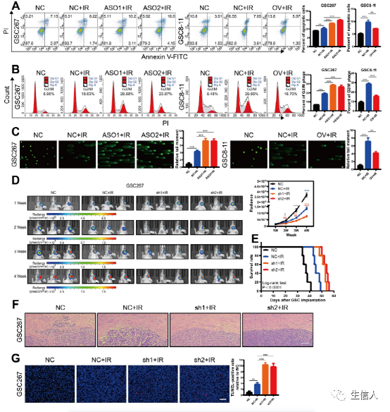 作者发现,放疗后GSCs表现出DNA损伤、G2/M阻滞和凋亡。与pGSCs相比,mGSCs在放疗后表现出更少的凋亡、G2/M阻滞和DNA损伤(图A,B,C)。此外,mGSCs中MIR222HG的下调增强了对放疗的应答。相反,pGSCs中MIR222HG的过表达会减弱对放疗的应答。体内实验证明,mGSCs中MIR222HG的敲低增强了mGSCs的放疗应答,减轻了肿瘤的发生,延长了mGSCs小鼠的生存期(图2D,E)。通过小鼠脑的HE切片,作者发现敲除MIR222HG联合放疗可显著降低肿瘤侵袭性(图2F)。组织切片的TUNEL实验也表明,MIR222HG的敲低促进体内mGSCs的凋亡(图2G)。相反,植入过表达MIR222HG的pGSCs的小鼠对放疗的反应性降低,肿瘤生长加快,放疗后存活时间缩短。脑切片HE染色显示,植入过表达MIR222HG的pGSCs并接受放疗组的肿瘤侵袭性显著增加。TUNEL实验表明,MIR222HG的过表达降低了体内肿瘤细胞的凋亡水平(图2G)。综上所述,MIR222HG在体内和体外均增强了mGSCs的放疗耐受性。