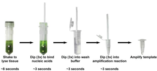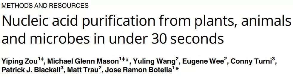 今天给大家推荐一种30秒内完成提取DNA的快速方法。该方法是来自澳大利亚昆士兰大学的研究人员发表在PLoS Biology上的题为“Nucleic acid purification from plants, animals and microbes in under 30 seconds”的论文,开发了一种新的核酸提取方法,利用滤纸可以在30秒内从植物、动物和微生物中快速的完成核酸的提取和纯化。