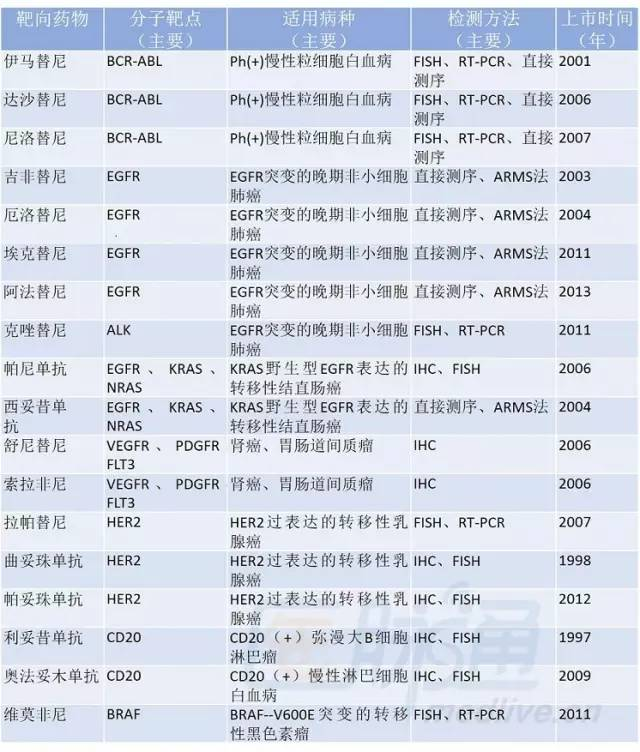 靶向药物诠释了“标准化”治疗为基础下的“个体化”治疗,即:靶向药物针对正常细胞和肿瘤细胞共同信号转导通路,但是作用于异常肿瘤信号转导通路不同于正常细胞信号转导通路的分子靶点。遂靶向药物获得“个体化”治疗的美誉,而“个体化”治疗的前提条件是个体分子靶点的检测。个体分子靶点检测包括:(1)个体基因突变靶点的检测;(2)个体基因扩增靶点的检测;(2)个体基因融合靶点的检测。随着分子细胞水平研究的深入相信会有越来越多的检测方法来检测越来越多的分子靶点。