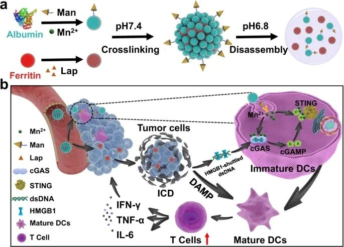 免疫疗法是一种很有前途的抗肿瘤方式,近年来引起了人们的极大兴趣,它是指能够刺激内源性免疫系统以引发抗肿瘤作用的广泛治疗类别。从机制的角度来看,免疫疗法的疗效主要依赖于肿瘤特异性效应T细胞的动员,在此期间,幼稚CD4+ T和CD8+ T细胞通过与抗原结合的II类和I类主要组织相容性复合物相互作用而被激活。MHC-II和MHC-I在抗原呈递细胞(APC)上表达。 然而,迄今为止,免疫疗法在实体瘤治疗中的应用一直具有挑战性,因为实体瘤可以在微环境中协调高度免疫抑制状态,以逃避T细胞介导的免疫消除。具体来说,肿瘤细胞可以通过抑制树突状细胞(DC)的成熟和活化来严重干扰抗原呈递过程,树突状细胞是人体中最有效的专业APC。由此产生的DC功能障碍将导致T细胞启动的严重失败并最终导致免疫耐受。因此,恢复和刺激DC功能已成为重振T细胞介导的抗肿瘤免疫的有希望的策略。环磷酸鸟苷-磷酸腺苷合酶(cGAS)-干扰素基因(STING)信号刺激物是人体内一种进化上保守的DNA感应机制,在调节肿瘤细胞和环境免疫细胞之间的串扰中起关键作用,表现为一个有希望的靶标,以提高免疫治疗对实体瘤的有效性。锰是人体必需的微量元素,其毒理学已广为人知,多种口服锰补充剂早已被批准用于预防或治疗与锰缺乏相关的疾病。从机制的角度来看,Mn2+ 可以直接与cGAS结合以增强其dsDNA敏感性和产生cGAMP的酶活性,从而即使在低水平的肿瘤来源dsDNA下也能刺激下游STING信号传导。另一方面,Mn2+ -cGAMP络合可以显着增强cGAMP的STING结合亲和力以促进STING活化,这比原始cGAMP高两个数量级。该研究报告了一种基于牛血清白蛋白(BSA)/铁蛋白的纳米激动剂,它结合了锰(II)离子和β-lapachone,它协同激活树突状细胞(DC)中的cGAS-STING信号传导,从而引发强大的适应性抗肿瘤免疫。Mn2+ -锚定甘露糖修饰的BSA和负载β-lapachone的铁蛋白交联以提供生物反应性蛋白质纳米组装体,其在酸性血管周围肿瘤微环境(TME)中解离成单分散的蛋白质单元,从而增强肿瘤穿透性和时空控制的Mn2+ 和β-lapachone分别递送至DCs和肿瘤细胞。β-lapachone引起免疫原性肿瘤细胞凋亡并将大量dsDNA释放到TME中,而Mn2+ 增强cGAS对dsDNA的敏感性并增强STING信号以触发下游免疫刺激信号。