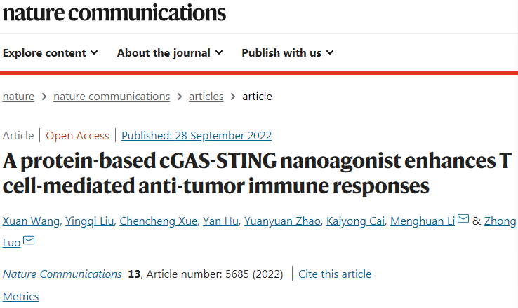 cGAS-STING通路是一种关键的DNA传感机制,是克服实体瘤免疫抗性的有希望的靶点。2022年9月28日,重庆大学罗忠及李孟桓共同通讯在Nature Communications发表题为“A protein-based cGAS-STING nanoagonist enhances T cell-mediated anti-tumor immune responses”的研究论文,该研究报告了一种基于牛血清白蛋白(BSA)/铁蛋白的纳米激动剂,它结合了锰(II)离子和β-lapachone,它协同激活树突状细胞(DC)中的cGAS-STING信号传导,从而引发强大的适应性抗肿瘤免疫。总之,cGAS-STING纳米激动剂增强了肿瘤特异性T细胞介导的针对体内免疫原性较差的实体瘤的免疫反应,为临床免疫治疗提供了一种强有力的方法。