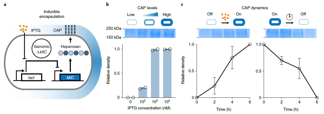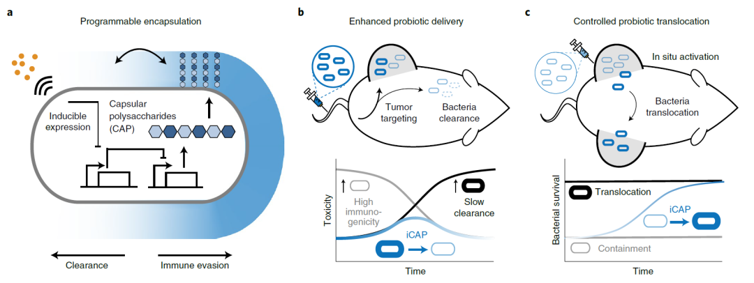 在这项最新研究中,研究团队集中研究了荚膜多糖(CAP),一种包裹细菌表面的糖聚合物,并开发了一种基因编码的微生物封装系统——诱导性CAP(iCAP),它可以调节和动态表达包膜多糖,以增强系统递送。
