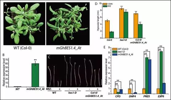 参考拟南芥中BES1基因突变位点,将GhBES1.4_At编码区氨基酸序列第216位脯氨酸(Pro)突变为亮氨酸(Leu)。然后将其转入拟南芥中,发现转基因拟南芥出现叶子卷曲,叶柄弯曲且变长等典型的BR过敏感表型。并且转基因拟南芥下胚轴表现出对BR合成抑制剂BRZ不敏感表型,这与拟南芥BES1功能获得型突变体bes1-D表型相似。因此证实了GhBES1.4_At参与到棉花BR信号通路中,并且发挥重要作用。该项工作为探究棉花BES1基因功能和BR影响纤维发育分子机制的解析打下基础。