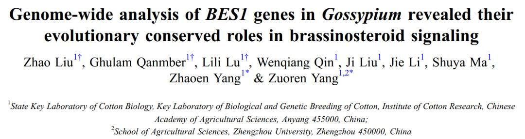 近日,SCIENCE CHINA Life Sciences 在线发表了中国农业科学院棉花研究所、棉花生物学国家重点实验室和郑州大学农学院题为 Genome-wide analysis of BES1 genes in Gossypiumrevealed their evolutionary conserved roles in brassinosteroid signaling 的研究论文。中国农业科学院棉花研究所博士生刘钊为第一作者,杨召恩博士和杨作仁副研究员为共同通讯作者。