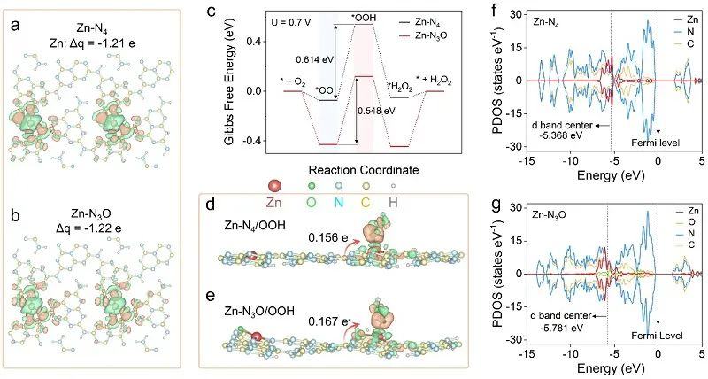 图6. Zn-N3O和Zn-N4位点的理论计算结果。Zn-N3O相比于Zn-N4位点更利于O2的吸附和关键中间体*OOH的形成,因而具有更高的本征活性。