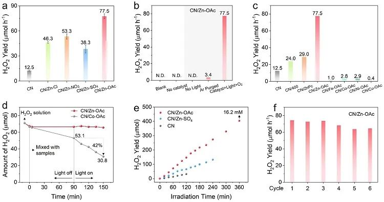 图5. CN/Zn-OAc、CN/Zn-SO4及对比样品的光催化合成H2O2活性。CN/Zn-OAc实现了优异的光催化产H2O2性能,达到77.5 µmol h-1,分别是未改性CN和CN/Zn-SO4的6.2倍和2倍,同时具备良好的稳定性。