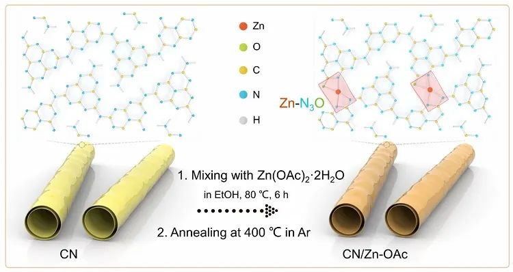 图2. CN/Zn-OAc制备流程示意图。首先,在管状CN上吸附醋酸锌,然后将其在惰性气氛中进行热处理得到CN/Zn-OAc。