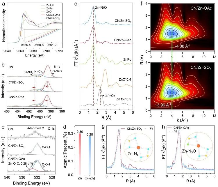 图4. CN/Zn-OAc和CN/Zn-SO4中Zn位点的配位结构表征。CN/Zn-OAc和CN/Zn-SO4中Zn位点为单分散位点且配位结构分别为Zn-N3O和Zn-N4。