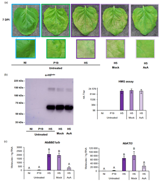 最后,作者发现对于共表达P19和H5的叶子,未处理的植物或喷洒模拟溶液的植物观察到相似强度的细胞死亡症状。对于喷洒抗坏血酸(AsA)的共表达P19和H5的叶子,观察到淡黄色,但几乎没有表现出坏死症状(图11)。因此,抗氧化剂的外源喷施可以减少与H5蛋白表达相关的应激症状。
