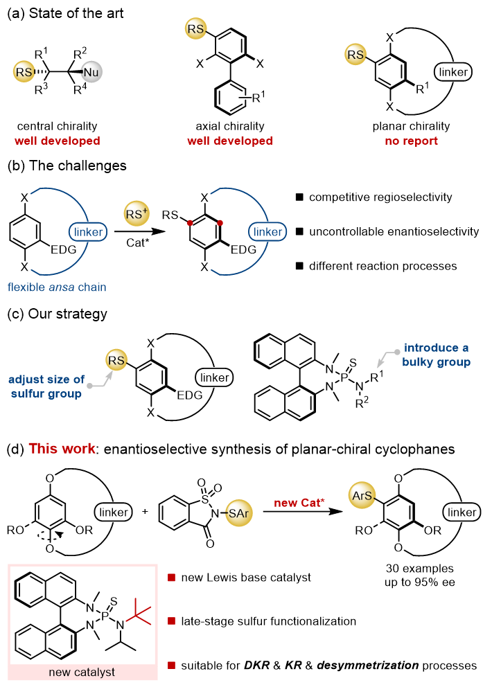 手性有机硫化物由于其独特的理化性质,在生物医药、功能材料和有机催化等领域都有广泛的应用。手性有机硫化物的重要性推动了其高效快捷合成策略的发展,其中美国伊利诺伊大学厄本那-香槟分校Denmark课题组、我国中山大学赵晓丹课题组以及上海交通大学陈志敏课题组等研究团队对不饱和烃的不对称亲电硫代反应进行了深入研究,使其成为中心手性和轴手性有机硫化物不对称合成的重要手段之一(Angew. Chem. Int. Ed. 2020, 59, 19796; Acc. Chem. Res. 2022, 55, 2439; Sci. China Chem. 2023, 66, 3331)。然而,利用该策略催化不对称合成平面手性有机硫化物却一直未有相关报道(Scheme 1a)。