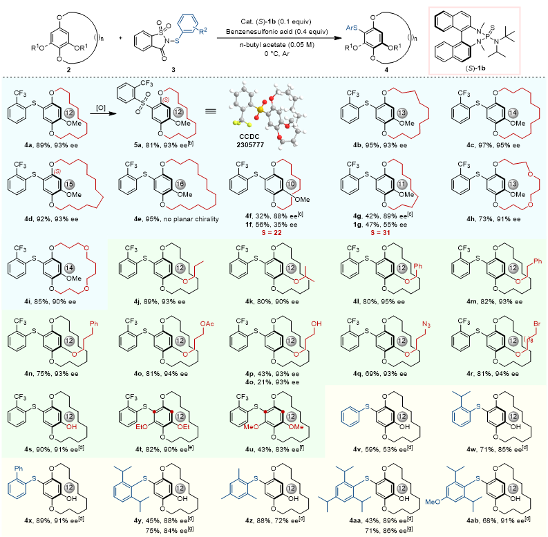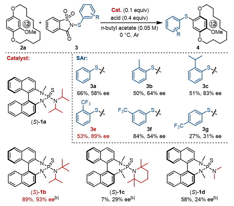 作者以[12]大环化合物2a为模板底物对反应条件进行了优化。条件优化过程中,作者发现邻位三氟甲基取代的芳基硫糖精试剂作为硫代试剂时(3e),能明显地提高产物的对映选择性;同时在催化剂中引入大位阻的叔丁基基团((S)-1b),进一步提高了产物的收率和对映选择性,这些实验结果与作者最初的研究设想相吻合(Scheme 2)。