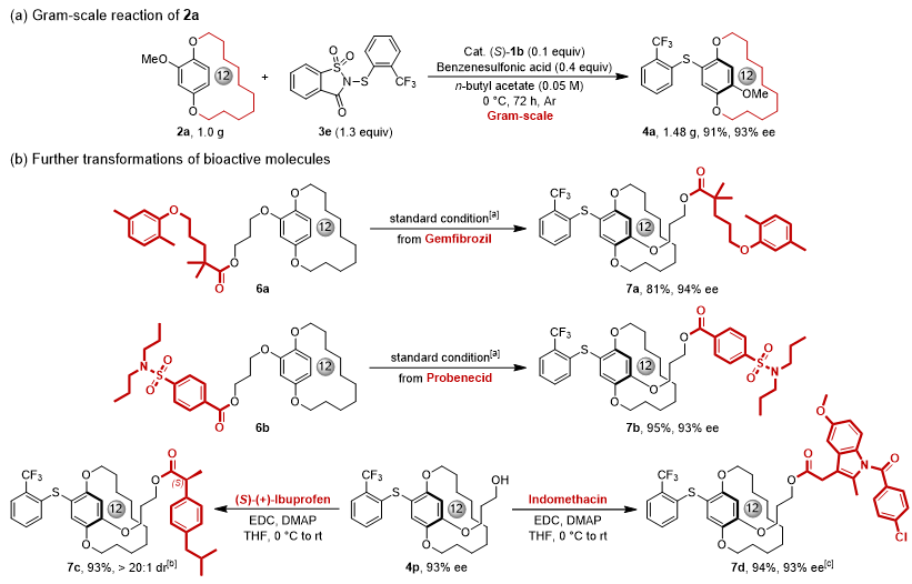 近期,上海交通大学化学化工学院陈志敏课题组与中国科学院上海有机化学研究所薛小松课题组合作,报道了一种手性路易斯碱催化不对称亲电硫代反应合成平面手性含硫大环化合物的方法(Scheme 1d)。