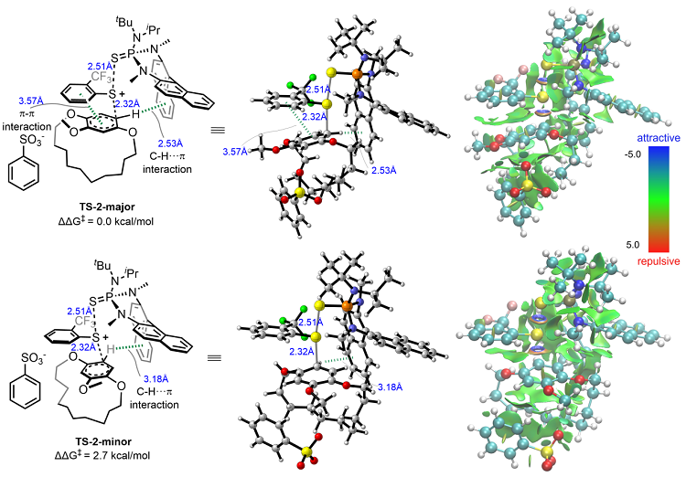 作者与上海有机所薛小松研究员合作,对催化不对称亲电硫代反应合成平面手性含硫大环化合物的反应机理进行了研究(Scheme 5)。结果表明芳基硫试剂与底物芳环之间的π–π相互作用以及底物芳环与催化剂萘环之间的C-H•••π相互作用在该反应的对映选择性控制中起到了至关重要的作用,使得两个手性过渡态的能量差值达到2.7 kcal/mol,这与实验观察到的立体选择性是吻合的。芳基硫试剂中的三氟甲基主要通过位阻影响不同过渡态中的π–π相互作用等,催化剂中叔丁基基团的引入创造了更加适合底物的手性口袋,从而提高了反应的选择性。