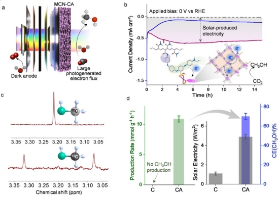 在太阳光照射下,MCN光电极能够产生连续的光生电子用于催化组分的活化,从而驱动CO2还原反应。该光电极在0 V vs RHE条件下能得到稳定的光电流。作者通过核磁共振氢谱检测了CO2还原产生的甲醇,并进一步通过13C同位素标记实验证明了甲醇的来源是通入的CO2。
