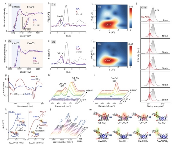 为了研究催化剂上CO2到甲醇的反应机理,作者对催化剂中钴和铜的结构和配位环境进行分析,并原位监测反应中间体的产生和转移过程。结果显示,CO2还原中存在两个过程,分别是CO2到CO,以及CO到甲醇。作者通过CO剥离实验比较金属钴和铜对于CO的吸附情况,同时利用原位拉曼光谱观察到反应中间体CO在铜位点上的大量累积。作者通过实验结合理论计算发现,在CO2还原过程中,CO2先经历在金属钴上转化为CO,然后CO转移到金属铜上进一步还原到甲醇。