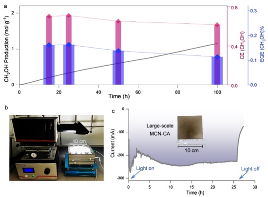 MCN光电极在光电催化CO2还原产甲醇中,能够连续稳定工作100 小时,表现出该光电极的高稳定性和催化选择性。考虑到MCN电极优异的性能以及简易的制备过程,作者进一步扩大了光电极的尺寸。当光电极面积从1 cm2扩展到100 cm2后,能够产生0.25 安培稳定的光电流,展示了该柔性光电极材料在规模化太阳能转化器件中的应用前景。