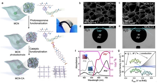 在光电催化中,光电器件的性能可以通过增强电极基底和光催化组分之间的界面接触来实现优化。作者采用化学聚合和逐层修饰的方法,通过锆-磺酸基配位桥联作用将光敏组分和催化组分稳定的负载在多孔网络表面。作为一种新型的有机光电极基底,MCN相比传统无机光电极表现出了许多优异的性能:多孔网络结构使其具有更高的比表面积以负载高密度的光催化组分,孔道表面丰富的官能团可以进一步用于调控电极材料的物理化学性能,电极表面良好的亲水性有利于发生水相催化反应,基底的高透光性可以有效地减少与光敏组分的竞争吸光,同时高导电性有利于光生电荷的快速传输。