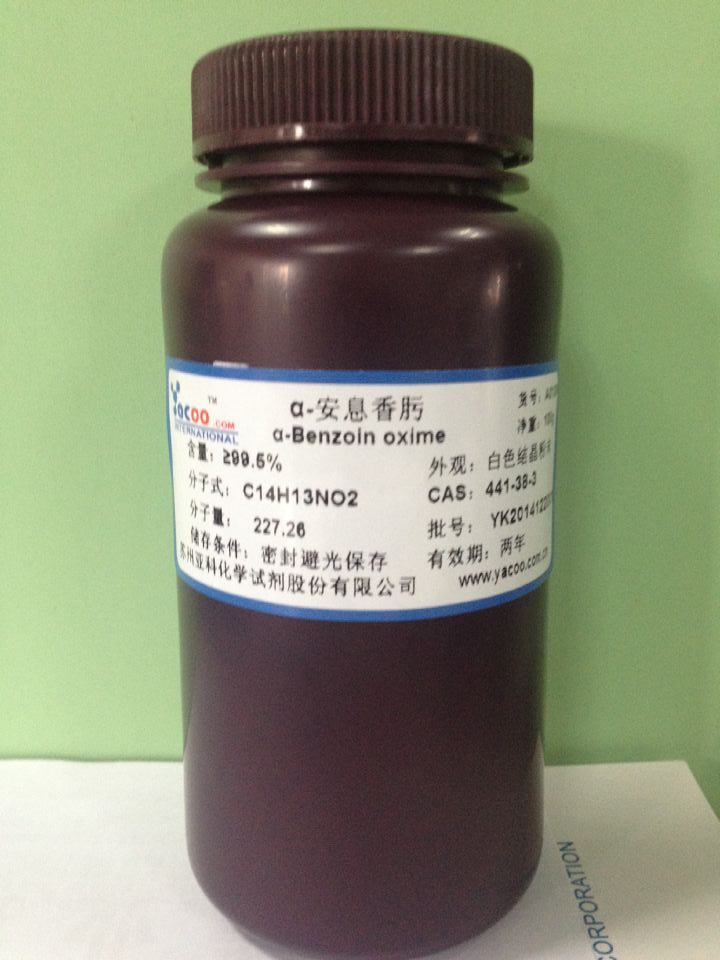 α-安息香肟是一种白色结晶性粉末,遇光后颜色逐渐变深。难溶于水,易溶于氨水及碱性溶液中,溶于乙醇、乙醚、丙酮及氯仿等有机溶剂。能与铜、钼、钨离子形成难溶沉淀,用作沉淀剂进行重量法测定或溶于有机溶剂进行萃取分离。也可用于分光光度法测定Pd(II), Pt(VI), Rh(III) ,生理研究测微量金属元素。医药方面用安息香肟催化氢化合成1,2-二苯基-2-氨基乙醇,后者是种医药中间体。