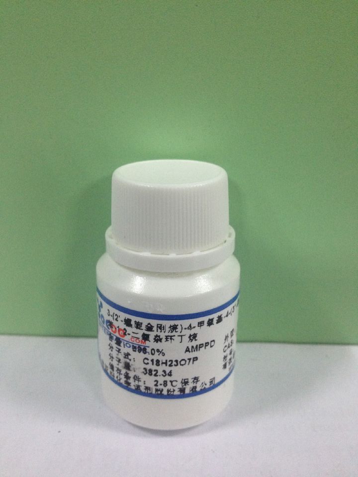 AMPPD是碱性磷酸酶的化学发光底物,在适宜的缓冲溶液中,随着酶的催化水解作用,AMPPD分解成AMP-D,后者发出强度很高的光信号,其发光的速度取决于碱磷酶的浓度。当碱磷酶偶合到杂交的探针时,便可以通过此系统检测到杂交分子的存在量。目前已广泛用作化学发光免疫分析的发光底物,已在医学上推广使用。但由于其价格较高,限制了其大规模的发展使用。