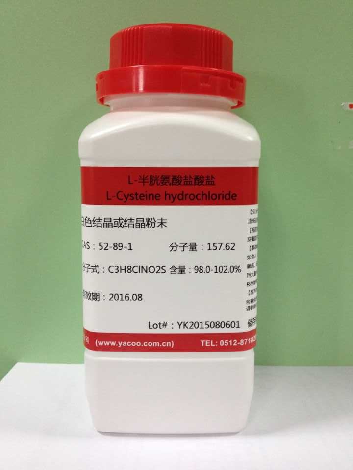 L-半胱氨酸盐酸盐具有还原性,有抗氧化和防止非酶褐变的作用,广泛用于化妆品、医药、食品等行业及科学研究中。在科研中主要用作组织培养试剂。L-半胱氨酸盐酸盐有吸湿性,因此要注意干燥保存。