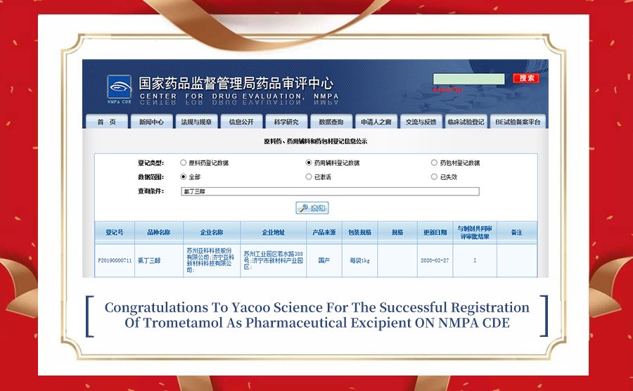 Congratulations To Yacoo Science For The Successful Registration Of Trometamol As Pharmaceutical Excipient ON NMPA CDE