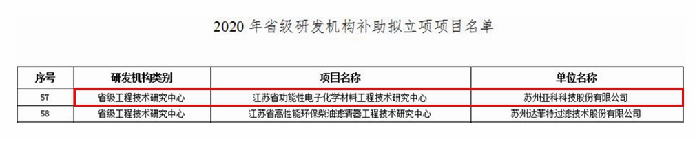 近日,苏州市科技局对2020年省级研发机构补助拟立项项目进行了公示,苏州市区2019年度新获批建设的105个省级研发机构将获得项目补助。苏州亚科科技股份有限公司因正式获批组建“江苏省功能性电子化学材料工程技术研究中心”成功入选公示名单。