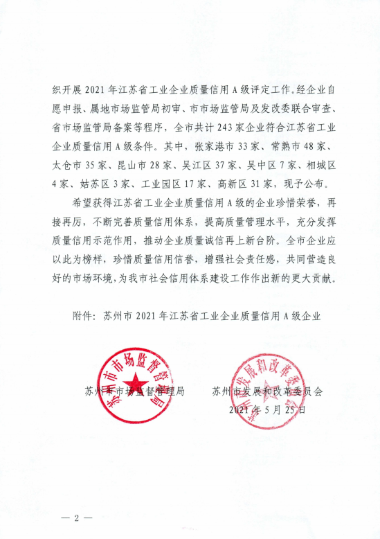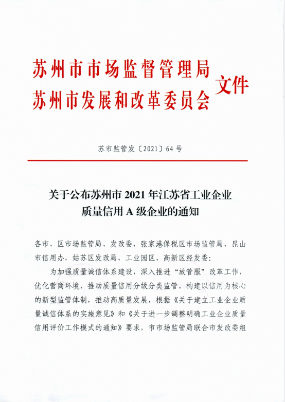 近日,苏州市市场监督管理局公布了2021年江苏省工业企业质量信用A级企业的名单,亚科股份成功入围。