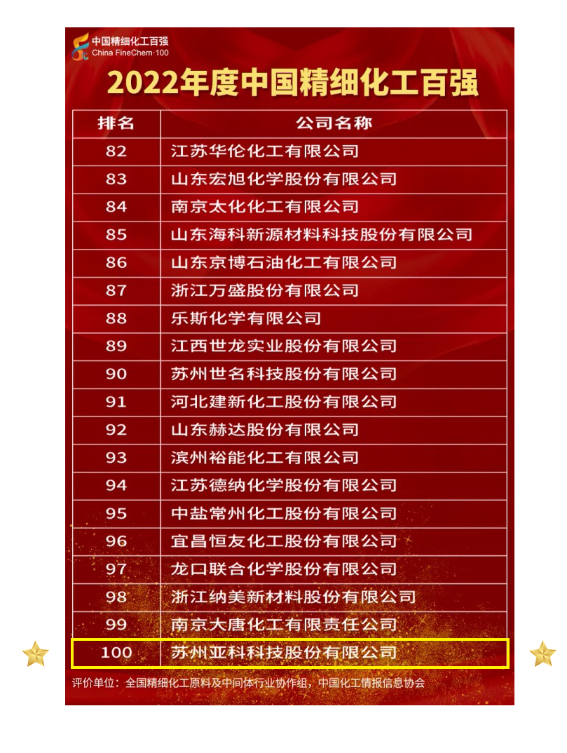 亚科股份荣登“2022中国精细化工百强”榜单
